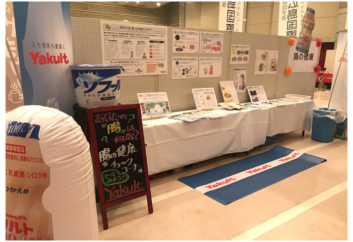 広島中央ヤクルトのブースでは、「あなたの『腸』は何歳ですか?」をテーマに、「健腸ラボ」の資材を用いた「腸年齢チェック」と、パネルを使って腸内細菌や腸内環境の大切さの説明を行ないました。「腸年齢チェック」を受けた方には「ヤクルト400LT」をプレゼントしたところ、たいへん喜んでいただけました。